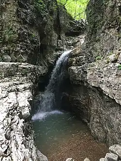 The "Walls" is an impressive geological feature that forms a large bowl shaped amphitheater. Embedded in the limestone are bowling ball size holes from which water drips and spouts, creating a unique water feature. This amphitheater gives rise to steep 200-foot (61 m) sheer rock walls that creates the natural feature defining the amphitheater. Turkey Creek drains through the "Walls" and has been an active geological force in creating the amphitheater.