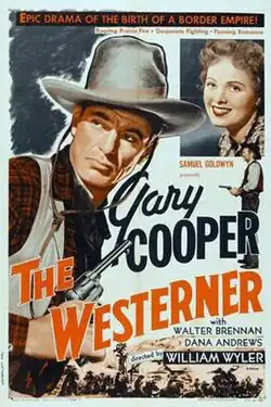 The Westerner is a 1940 American Western film directed by William Wyler and starring Gary Cooper, Walter Brennan and Doris Davenport. Written by Niven Busch and Jo Swerling (from a story by Stuart N. Lake), the film concerns a self-appointed hanging judge in Vinegaroon, Texas, who befriends a saddle tramp who opposes the judge's policy against homesteaders. The film is remembered for Walter Brennan's performance as Judge Roy Bean, for which he won his record-setting third Academy Award for Best Supporting Actor. James Basevi and Stuart N. Lake also received Academy Award nominations for Best Art Direction, Black and White and Best Story, respectively.[2][3] The supporting cast features Dana Andrews, Chill Wills and Forrest Tucker.