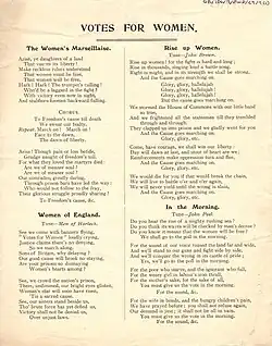 - ^ "'Women's Marseillaise' Sung by Suffragettes". The Bridgeport Times and Evening Farmer. 2 May 1911. p. 8. Retrieved 19 January 2020 – via Newspapers.com.