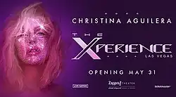 When speaking about the set, Aguilera called it her most ambitious show yet.[9] The poster used in the marketing for the show features Aguilera with pink sparkles on her face, forming a pink sparkly mask. This mirrored the show's intention to make the viewer remove the mask they wear everyday and "try on another one", making the show a "safe space" for the audience.[10][11] Separated into several acts, Christina Aguilera: The Xperience[12] was designed to be a five sensory experience, stimulating the five human perception senses: vision, hearing, scent, touch, and taste.[13] The visual aspect of the show involved each act having its own distinct colors, fashion, and visuals. The music featured on the show included material from six English-language studio albums in Aguilera's catalogue, the Burlesque soundtrack (2010), and other singles. Several remixes were included in the show. Songs like "Your Body" and "Accelerate" were performed in the format of their official remixes, while "Can't Hold Us Down", "Candyman", and "Feel This Moment" were remixed to include elements of other songs. One of the main attractions of the show and the most emphasised aspect of the five sensory experience was the scent pumping system. Scent pumps were installed throughout the auditorium, providing a signature scent for each act. The audience could touch and interact with objects that descended from the ceiling, while the taste aspect of the show referred to orders that attending viewers could place, such as the Xtini (portmanteau of Xtina, Aguilera's nickname, and martini).[14] Several numbers and visuals from the show were adapted and used on The X Tour, which ran concurrently with the residency. Aguilera released her thirteenth fragrance, Xperience, in 2019, which is named after the residency. A fifth leg was announced as the final leg of the residency. Due to the COVID-19 pandemic, the shows were put on hold. On September 30, 2020 the shows were canceled.[15]
