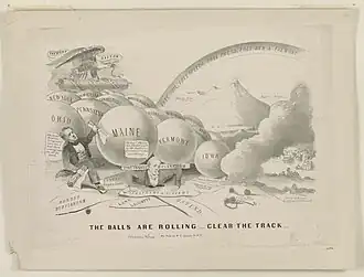 The twin relics of barbarism refer to the popular nineteenth-century phrase that linked the practices of slavery and polygamy in the United States. Attention to these twin relics increased following the 1856 Republican National Convention as the party acknowledged both practices in their party platform. Within the party's planks, they called on Congress to firmly denounce the "twin relics of barbarism – Polygamy and Slavery."[1] During this period, slavery was widely practiced among southern states, and polygamy was becoming prevalent among members of the Church of Jesus Christ of Latter-day Saints (popularly referred to as Mormons). The growth of these practices stoked fear and uncertainty in the nation at large as the two practices were seen as "incongruous with the pure and the free, the just and safe principles inaugurated by the [American] Revolution."[2] As a result of the widespread opposition to each, they were increasingly coupled together in national print media throughout the country.