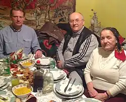 Thede Kahl (left) together with the Romanians Viorel Rogoz (center, another ethnographer) and Victoria Lelea (right, a former worker at the Satu Mare railway station) at Marna Nouă, Romania