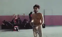 The video contains many scenes involving violence. It starts off with a shirtless Gambino dancing through a warehouse, interacting with a series of chaotic scenes. According to Murai, the video was inspired by the films Mother! and City of God. Prettyman states "The video tests us, taunting us to keep pace as we try to decode every gesture and calculation".[26] Choreographed by Sherrie Silver, Gambino and his entourage of young dancers perform several viral dance moves including the South African Gwara gwara and "Shoot" popularized by BlocBoy JB, who is one of the ad-lib contributors on the song. Gambino's dancing is contrasted against moments of violence. Only 53 seconds into the video, Gambino shoots a man in the back of the head with a handgun, while assuming a comical stance similar to a Jim Crow caricature. The first person depicted as being shot in the video, a guitarist who had been accompanying Gambino's singing up to that point, was musician Calvin the Second. This first shooting also marks a transition in the music, from an African "folk-inspired melody" to "dark, pulsing trap".[27] At a later point, Childish Gambino uses a Kalashnikov patterned automatic weapon to gun down a church choir.