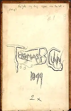 Thomas Butler Gunn's name is associated with the bohemian set of writers and artist of New York who often frequented Pfaff's beer cellar. In Gunn's diaries, he mentions many of them and describes their lives, often in terms of gossip. His milieu included individuals such as Frank Bellew, Sol Eytinge Jr., Fanny Fern, Thomas Nast, James Parton, Fitz James O'Brien, Alfred Waud and Walt Whitman.[21] His diaries of this period have been transcribed by the Missouri History Museum.[22]