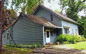 The south-facing front facades of both blocks feature windows and an entrance in the westernmost bay. The main block's door is a board-and-batten piece that retains its original ironwork. There is a single window on the west elevation; on the east is a three-sided projecting bay window added later on. A brick chimney comes up from the roof at the west.[2]