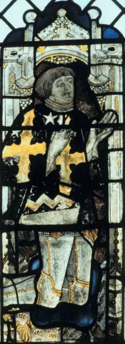 Thomas Peyton (1418–1484) of Isleham, Cambridgeshire, was twice Sheriff of Cambridgeshire and Huntingdonshire, in 1443 and 1453.[1] He rebuilt the church of St Andrew's in Isleham,[2] in the chancel of which survives his monumental brass.[3] He is depicted in a 1485 stained glass window in Long Melford Church, Suffolk, where he displays on his surcoat the Peyton arms: Sable, a cross engrailed or a mullet in the first quarter argent.