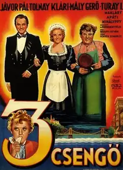 Three Bells (Hungarian: Három csengö) is a 1941 Hungarian comedy drama film directed by Imre Apáthi and Félix Podmaniczky and starring Pál Jávor, Klári Tolnay and Ida Turay.[1] [2] It was shot at the Hunnia Studios in Budapest and on location around the city. The film's sets were designed by the art director István Básthy.