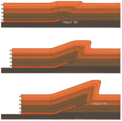 Fault-propagation folds form at the tip of a thrust fault where propagation along the decollement has ceased, but displacement on the thrust behind the fault tip continues. The formation of an asymmetric anticline-syncline fold pair accommodates the continuing displacement. As displacement continues, the thrust tip starts to propagate along the axis of the syncline. Such structures are also known as tip-line folds. Eventually, the propagating thrust tip may reach another effective decollement layer, and a composite fold structure will develop with fault-bending and fault-propagation folds' characteristics.