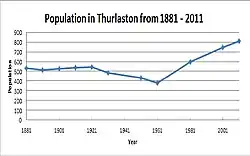 Census data extends Thurlaston's population history back to 1881, with a population of 533. The population remained stable with little fluctuation until a decline to 378 during the 1961 census, however following this a steady growth saw the total rise to today's figure of 807, the highest figure so far recorded.