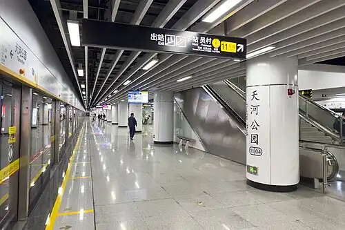 Tianhe Park station (Chinese: 天河公园站) is an interchange station between Line 11 and Line 21 of the Guangzhou Metro, and the western terminus of Line 21. It started operations on 20 December 2019.[1] With the opening of Line 11, Line 21 was truncated to here from Yuancun since 2 October 2024, as to allow renovation works in preparation for Line 11 trains to serve that station instead. Line 11 started serving this station on 28 December 2024.[2] It will also be an interchange station with Line 13 in 2025.[3]
