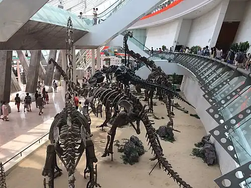 The lobby of the museum displays several dinosaurs, including a cast of a Tyrannosaurus Rex and skeletal mounts of Mamenchisaurus, Omeisaurus, and Bellusaurus.