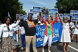 Jackson at the Maura Hennigan 2012 Boston Caribbean Carnival parade, with Ayanna Pressley, Elizabeth Warren, and Maura Hennigan