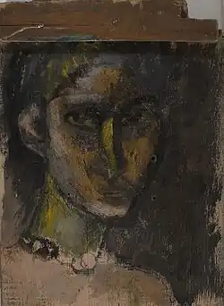 "Self portrait with beads" mixed media, gold leaf on wood sm 34X24,5 Fiesole, Italy, 2000
