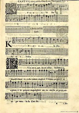 Tomás Luis de Victoria (sometimes Italianised as da Vittoria; c. 1548 – c. 20–27 August 1611) was the most famous Spanish composer of the Renaissance. He stands with Giovanni Pierluigi da Palestrina and Orlande de Lassus as among the principal composers of the late Renaissance, and was "admired above all for the intensity of some of his motets and of his Offices for the Dead and for Holy Week".[1] His surviving oeuvre, unlike that of his colleagues, is almost exclusively sacred and polyphonic vocal music, set to Latin texts. As a Catholic priest, as well as an accomplished organist and singer, his career spanned both Spain and Italy. However, he preferred the life of a composer to that of a performer.[2]