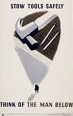 The start of World War II in 1939 effectively marked the end of Eckersley's partnership with Lombers, as they joined different military services and there was a decline in demand for commercial advertising. This led Eckersley to create posters for the Royal Society for the Prevention of Accidents (RoSPA), aimed at workers in factories and industrial settings that often supported the military in someway. These posters are striking in their bluntness; with little text it is the illustration that catches the eye. Most use block colours and cut out shapes to form the designs. Having originally joined the Royal Air Force and being charged with cartographic work, Eckersley was transferred to the Publicity Section of the Air Ministry, this allowed him to work from home and take commercial commissions again, for example from the General Post Office. In 1948 his contribution was recognised with the granting of an Order of the British Empire (OBE) for services to poster design. During the war the realisation of the posters ability to communicate complex messages was recognised, as propaganda messages were successfully conveyed by posters and mass media was developed.