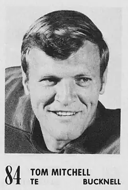 A 6'2", 215 lb (98 kg). tight end from Bucknell University and member of the Bucknell Athletics Hall of Fame, Mitchell played one season (1966) for the American Football League (AFL)'s Oakland Raiders, and ten seasons (19681977) in the National Football League (NFL) for the Baltimore Colts and the San Francisco 49ers. He was nicknamed "the Crocodile" and his pouring of a pitcher of beer on the head of author George Plimpton is recounted in the book Mad Ducks and Bears. He died of cancer at the age of 72 in 2017.[2] He was father-in-law to former Tampa Bay Buccaneers and current Rutgers head coach Greg Schiano, and grandfather to Bucknell defensive lineman Joe Schiano.