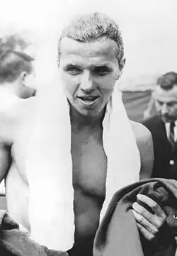 Tom Stock (born c. 1942)[2] is retired American backstroke swimmer. During his career that spanned from about 1956 to 1964 he set several world and 14 national records. He missed the 1964 Olympics due to illness and was not selected for the 1960 Games because he finished third at the trials, whereas only two swimmers were chosen in that year. He was American Swimmer of the Year in 1962. In 1989 he was inducted to the International Swimming Hall of Fame.[1]