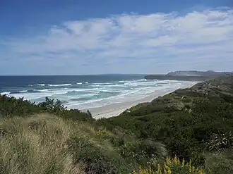 Tomahawk Beach is approximately 1 kilometre (0.62 mi) long and faces due south. To the west the beach is bounded by the cliffs of Lawyers Head, beyond which lies Ocean Beach, Dunedin's most popular beach (the near end of which is referred to as "St Kilda Beach"). Approximately 100 metres (330 ft) east of the cliffs Tomahawk Beach is divided by the outlet channel of Tomahawk Lagoon; the beach's main access track runs along the dunes immediately above this channel.[5] To the east, Tomahawk is separated from Smaills Beach by Tomahawk Bluff, a small promontory of black volcanic rock punctuated by sea caves,[6] on the top of which stands the Jack Fox Lookout. At very low tides the base of the promontory is exposed, making Tomahawk and Smaills effectively a single beach.[5] Northward, the beach rises into scrub-covered dunes and a steep slope leading up to the suburb of Ocean Grove.[4] The beach slopes strongly southward between the tide lines but flattens out below the low tide mark. The swell is usually strong. Both headlands are associated with rip currents and there is usually a rip current near the middle of the beach.[7]