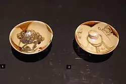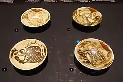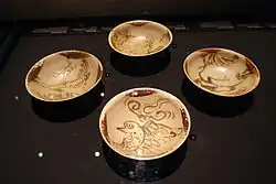Tongguan is an ancient town with a history of over 2,100 years. There was a bridge named Wuchu (吴楚桥) at Shigang (誓港), According to legend, the bridge was at the boundary point of Wu and Chu states in the Warring States period (476–221 BC). The unearthed earthenwares at Mawangdui proved that at latest Tongguan started to produce potteries in the western Han periods (206 BC–9 AD). The archaeological excavation at Tongguan Kiln Site showed that, the technology of underglazed color figure was originated there in the Tang (618–907 AC) and Five Dynasties periods (907–960 AC). The production of underglaze wares was once prosperous at the later Tang period, and declined in the Five Dynasties periods in the place.[6]