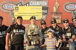 Tony Schumacher (center, to the right of the U.S. Army soldier) and crew with 2009 Top Fuel championship trophy