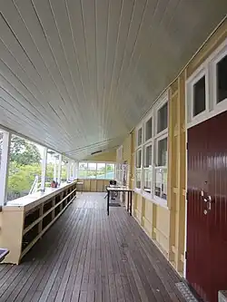 The north verandah has a timber balustrade; stop-chamfered verandah posts and beams; and a raked ceiling lined with diagonal wide timber beaded boards above exposed rafters. Original tall, vertically centre-pivoting windows survive at the western end of the verandah wall. Also at the western end is a former hat room enclosure with metal hooks attached to the walls. The enclosed south verandah retains stop-chamfered verandah posts and beams, and a raked ceiling lined with diagonal timber beaded boards above exposed rafters. The enclosed western verandah retains a raked ceiling lined with diagonal timber beaded boards above exposed rafters; rows of metal hooks mounted to the verandah wall; and remnant walls of a former hatroom at the northern end.[1]