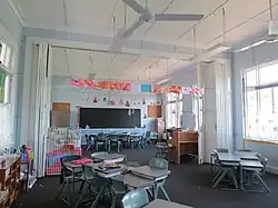 All classrooms measure 21 by 24 feet (6.4 by 7.3 m) and have flat internal wall and ceiling linings. Sections of early linings are distinguished by the use of batten or curved cover strips. In the 1956 section, a large opening between the classrooms remains, however folding doors (shown on the original plans) have been removed. Early, half-glazed double doors survive in the centre of the wall between the 1953 and eastern 1951 classrooms. Between the 1951 classrooms, one connecting door has been enclosed, and the other has been removed and a large opening created in its place.[1]