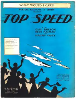 Top Speed is a musical in two acts with music by Harry Ruby, lyrics by Bert Kalmar, and a book co-authored by Guy Bolton, Ruby, and Kalmar. The musical is set at the Onawanda Lodge, a fictional resort in the Thousand Islands that sits on the American side of the Canada–United States border in New York. The story follows two young and financially poor American men who fall in love with two wealthy American heiresses while vacationing far above their economic means. Misadventures ensue when the boys are asked to pilot a speed boat owned by one of the girls in an international boat race.[1]