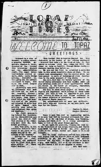 1. ^ a b Wakida, Patricia (April 16, 2014). "Topaz Times (newspaper)". Densho Encyclopedia. Retrieved November 5, 2024.