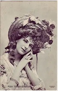 She also joined the company of George Edwardes where, in the early 1890s, she appeared in the burlesques Cinder Ellen up too Late and Don Juan.[8] Also at the Gaiety, Edwards cast her in In Town (1892), and, in 1894, still aged 16, she danced in A Gaiety Girl at Daly's Theatre and then played the role of Violet Deveney in Edwardes's hit Edwardian musical comedy, The Shop Girl, at the Gaiety.[4][9] At the invitation of Harris, Sinden then danced in grand operas at Covent Garden until his death in 1896.[4][5] In 1897, she was principal dancer in The Yashmak at Shaftesbury Theatre[4] and was also dancing at the Avenue Theatre opposite Lottie Venne.[10] In 1899, with Edwardes's company at Daly's Theatre, she played Trixie in San Toy, in which she "contributes a graceful dance".[11] She also performed in music hall and pantomime (usually as "principal girl") during these years, including at the Britannia Theatre, the Metropole Theatre in Camberwell, and elsewhere.[4][12][13]