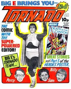 The first issue of Tornado was dated 24 March 1979, and included a free 'Turbo Flyer' - apparently "designed with the same aerodynamic manoeuvrability" as the Tornado strike-fighter - complete with instructions inside the cover to only use the thing outside. Further editorial characters were invented - mild-mannered Percy Pilbeam played the Clark Kent to the Big E's Superman, with Samantha 'Sam' Stevens as Lois Lane, while Billy Preston was apparently a gung-ho young roving reporter finding stories for Tornado. Readers were to write to Percy with their questions and Sam as - unusually for a boys' comic - an agony aunt, offering to help readers with "hassles with Big Sis' using her nail varnish on your plastic models". Big E and his cohorts also encouraged readers to be heroes themselves by performing good deeds, and write in about them.[15][16]