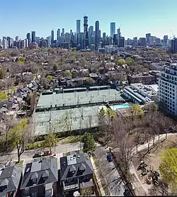 The actual courts were established at 148 Front Street in Toronto in 1874 by I.F. Hellmuth, two years before the club was formed in 1876. The club played host to a tournament in 1881 (for gentlemen's singles) that over time became the Canadian Open tennis championship, now known as the National Bank Open.[4] The location of the club moved to Rosedale in 1913.[5] The surface for the courts was red clay.