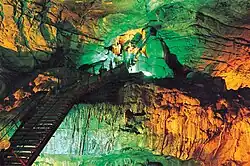 The Belum Caves in Nandyal District have a length of 3,229 metres (10,594 ft), making them the second largest natural caves on the Indian subcontinent. The Belum Caves derive their name from Bilum, the Sanskrit word for caves. The caves have long passages, spacious chambers, freshwater galleries, and siphons. The caves' deepest point is 120 feet (37 m) from the entrance and is known as Patalaganga.