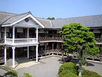 Toyoma Education Museum exhibits the history of education in Japan since the Meiji period. It is housed in the former Tome Elementary School Building (旧登米高等尋常小学校校舎) of 1888 in the city of Tome, Miyagi Prefecture. The U-shaped two-storey building around a courtyard, lined with balconies and with half-hexagons at the end of each wing, was designed by Kisaburo Yamazoe. It is representative of the western-inspired architecture of the Meiji period and in 1981 was designated an Important Cultural Property.[1][2][3][4][5]