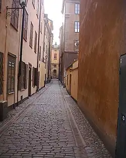 Trädgårdsgatan (Swedish: "Garden Street") is a small street in Gamla stan, the old town of Stockholm, Sweden. It stretches west from Skeppar Olofs Gränd to Källargränd, just south of the Royal Palace and north of the square Stortorget. Forming a parallel to Slottsbacken and Köpmangatan, it is intercepted by Trädgårdstvärgränd. On the northern side of the street are gates leading to Bollhustäppan. It is named after the royal gardens once located along its northern side.[1]