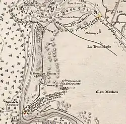 Approximately 1.2 km (0.75 mi) north of the forestry house Maison Forestière des Clones, a branch line merged the main line from the east. It served the forest area la Pointe Espagnole not far from the beach.[Note 4][13][14]
