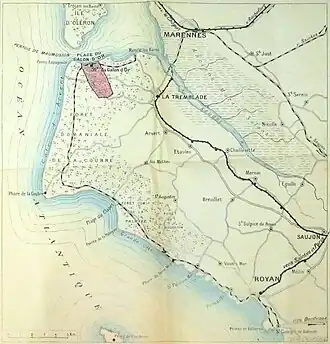 At the beginning of the 19th century, the Bréjat marsh (marais de Bréjat) was converted into pastureland. A drainage canal was dug, equipped with a sluice gate (Le Clapet) to prevent salt water from entering at high tide, and the beach was named "Plage du Clapet". From 1824, the dunes were planted with maritime pines. The marsh of Bréjat was eventually flooded by the sea and a sandbank formed at the Pointe de la Coubre, creating the bay of Bonne Anse, which closed, silted up and silted up by the currents.[16]