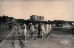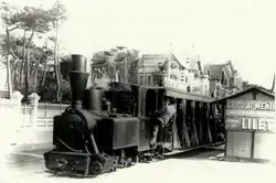 The metre-gauge forest railway originally started at the La Combe à Massé quarry in 1868. Initially used mainly by workers and employees for silvicultural work, the forest railway was also used by summer visitors after reforestation was completed. In the newspaper Le Gaulois of 21 July 1884 and 11 August 1884, an advertisement appeared for "visits by forest railway to La Palmyre, La Coubre, the Pavillon Bonne-Anse, the Pointe Espagnole, the Galon d'Or, the forest and dolmens of Combots, the forest of Arvert, etc."[4][17]