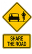 The third sign is the rarest of all, with a car on the left side, a cyclist on the right, and a sign saying "Share the road". This sign is located on busy road where it is narrow enough that motorists and cyclists have to share a lane.
