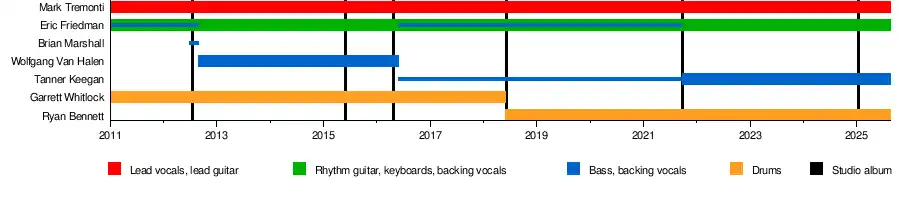 Tremonti is an American heavy metal band founded and fronted by lead vocalist and guitarist Mark Tremonti, best known as the lead guitarist of the rock bands Creed and Alter Bridge.[4] The band also consists of rhythm guitarist Eric Friedman, bassist Tanner Keegan and drummer Ryan Bennett. Bassist Wolfgang Van Halen and drummer Garrett Whitlock are former members of the band. Mark Tremonti's Creed and Alter Bridge bandmate Brian Marshall was also a member in 2012.