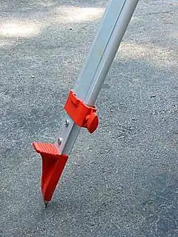The tripod is placed in the location where it is needed. The surveyor will press down on the legs' platforms to securely anchor the legs in soil or to force the feet to a low position on uneven, pock-marked pavement. Leg lengths are adjusted to bring the tripod head to a convenient height and make it roughly level.
