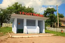 Trostianets (Ukrainian: Тростянець, romanizedTrostyanets, Russian: Тростянец, romanizedTrostyanets, Polish: Troscianiec, Troscaniec, Yiddish: טראָסטיניץ, romanizedTrostinits) is a village of 428 people in Ternopil Raion (county) of Ternopil Oblast of western Ukraine. It belongs to Saranchuky rural hromada, one of the hromadas of Ukraine.[1] Trostianets lies in the very heart of the historic region of Halychyna (Eastern Galicia). The current population is decreasing as a result of the remoteness of the village, and many houses are left empty. The village is located in a very remote forest area about 20 km south-west of Berezhany, among thick and large forests which provided the name for the village - Trostyanets (from "Troshchi," thick woods). The landscape is very picturesque, with a little brook in the village valley, surrounded by pasture hills on both sides. One hill's name is "Sus' hill" from the Tartar word "sus," swine. There was a fire post on that mountain which gave signs when the Tartars came to invade. There is a lake at the southern end of the village. The closest villages are Siltse (locally referred to as Siulko) and Bozhykiv (formerly Kvitkove).