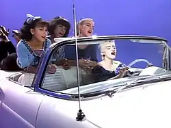 Screenshot of the official "True Blue" video, showing Madonna driving a Thunderbird convertible with her girlfriends in the back.