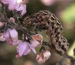 The larva is reddish brown or pinkish ochreous; the lines pale or white, broken up and edged with fuscous marks; spiracular line pinkish white, edged above with dark and feeds on heather and related genera (e.g. Erica).[4] The species overwinters as a larva.