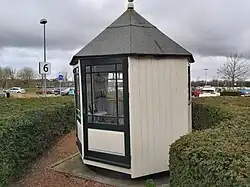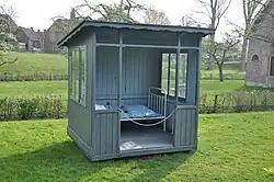 The original purpose of the hut was that the patient could recover by resting in solitude. The patient was supposed to stay in the hut night and day, and this stay could take months or even years.[2] The huts were acquired for other purposes too, like a summerhouse or gazebo. At least the Irish playwright George Bernard Shaw and sexologist Havelock Ellis are known to have owned a revolving "writing hut".[1] Until the late 1940s tuberculosis patients were often put in tuberculosis huts.[6] With the introduction of effective medication in the 1950s the huts lost their original purpose and started to serve new ones.[2][7] In 1982 the collection of the Netherlands Open Air Museum was expanded with a tuberculosis hut, as a gift from the National Cross Association.[3] One of the open-air TB huts of Montcalm Sanitarium in Manitou Springs, Colorado was donated to the Miramont Castle museum in 1998.[8] Rijksmuseum Boerhaave in Leiden (The Netherlands) owns a hut since 2011 and Open Air Museum Het Hoogeland in Warffum (The Netherlands) owns one since April 2016.[2]