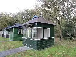 Tuberculosis huts existed in various forms, but in general they were simple premanufactured wooden buildings, that could be put together on the spot.[3] They were white or green, with a lot of glass to allow the entering of as much sunlight as possible. On the front side, the houses were either fully open, or they contained large doors that could be opened wide.[4][2][1] The huts in Colorado Springs were fixed to one place. The type of huts that was used in British hospitals, could be rotated on turntables towards the sun and out of the wind, to optimise the recovery conditions for the patients.[1] In the Netherlands, both the fixed and the revolving types could be found.[2][5][4]