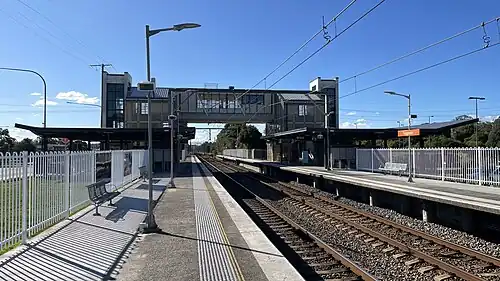 Tuggerah railway station is located on the Main Northern line in New South Wales, Australia. It serves the northern Central Coast suburb of Tuggerah, opening in 1890 as Tuggerah Lakes. It was renamed Tuggerah on 1 January 1891.[3] A pair of passing loops were added north of the station in 1948.[4] These were removed in December 1995.[5] The station was rebuilt in the 1990s.