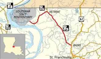 Louisiana Highway 66 (LA 66) is a state highway located in southeastern Louisiana. It runs 19.62 miles (31.58 km) in a general east–west direction from the main entrance of the Louisiana State Penitentiary at Angola to a junction with U.S. Highway 61 (US 61) north of St. Francisville.