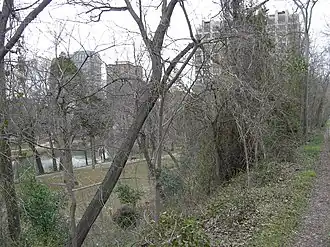 The Meanders are the original riverbed of the Trinity River through Dallas. For flood control purposes, the Meanders section was rerouted through underground culverts in the early 20th century. The main riverbed was also redirected through a new channel excavated to the west. The channel was engineered with levees and pumps, allowing real estate development of an industrial district in the area.[1]