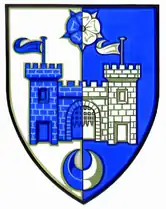 Per pale Argent and Azure, a castle of two towers flagged each with postern and window, and portcullis raised, all counterchanged, and in chief a rose also counterchanged, and in base a crescent likewise counterchanged.[22]
