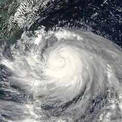 Shortly after it was named, Dujuan quickly intensified after an upper-level low to the northwest improved outflow to the north.[5] On August 30, the ridge to the north built eastward, causing the storm to slow and turn more to the northwest.[5] That day, an eye developed in center,[2] and the JMA upgraded Dujuan to typhoon status. Subsequently, the typhoon accelerated to the west-northwest and later to the west. On September 1, the JMA estimated Dujuan attained peak 10–minute sustained winds of 150 km/h (93 mph).[3] Around the same time, the JTWC assessed peak 1–minute winds of 230 km/h (140 mph), making it the equivalent of a Category 4 on the Saffir-Simpson hurricane wind scale. While near peak intensity, the center of Dujuan passed about 45 km (28 mi) south of the southern tip of Taiwan.[5] While moving westward through the South China Sea, the typhoon weakened slightly after its peak intensity due to an eyewall replacement cycle.[2] Radar from the Hong Kong Observatory indicated an inner eye about 20 km (12 mi) in diameter, and an outer eye about 100 km (62 mi) in diameter.[6] At around 1200 UTC on September 2, Dujuan made landfall just east of Hong Kong,[3] near Shenzhen.[6] The JMA estimated the typhoon had weakened into a severe tropical storm by the time of landfall,[3] while the JTWC estimated winds of 185 km/h (115 mph).[5] It was considered the strongest typhoon to strike the Pearl River Delta since Typhoon Hope in 1979.[7] Dujuan rapidly weakened while continuing westward through China, dissipating on September 3 over Guangxi.[3]